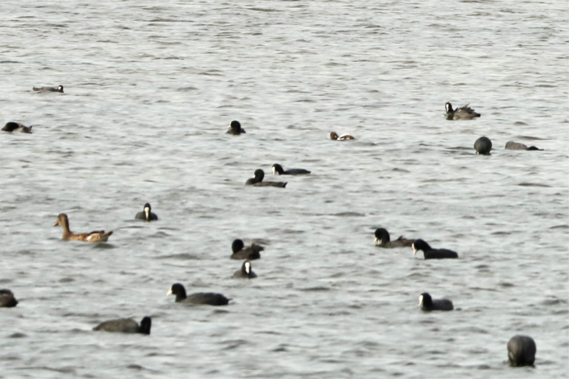vlnr: Krakeenden, Kokmeeuw & Meerkoeten met Brilduiker mannetje